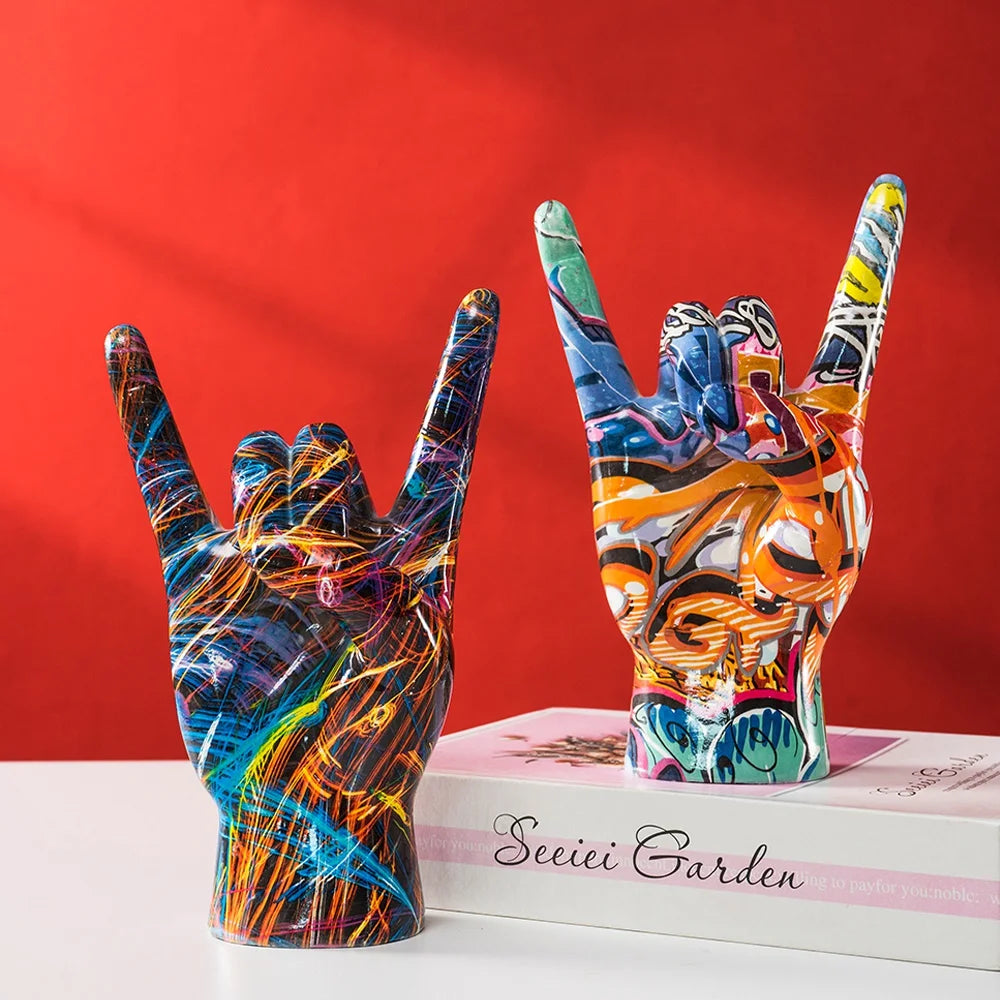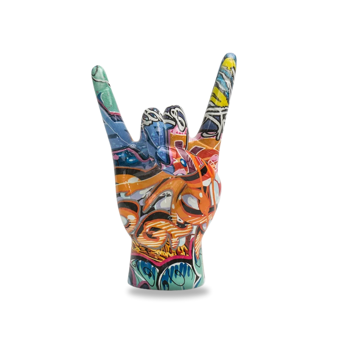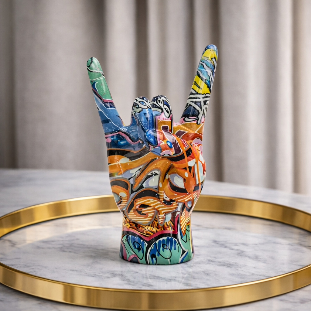 Ritmo é mais do que uma homenagem ao rock — é uma afirmação de identidade. A clássica mão em gesto de “rock on”, eternizada em resina com design moderno, ganha presença marcante e transmite a força da música, da rebeldia e da arte urbana.