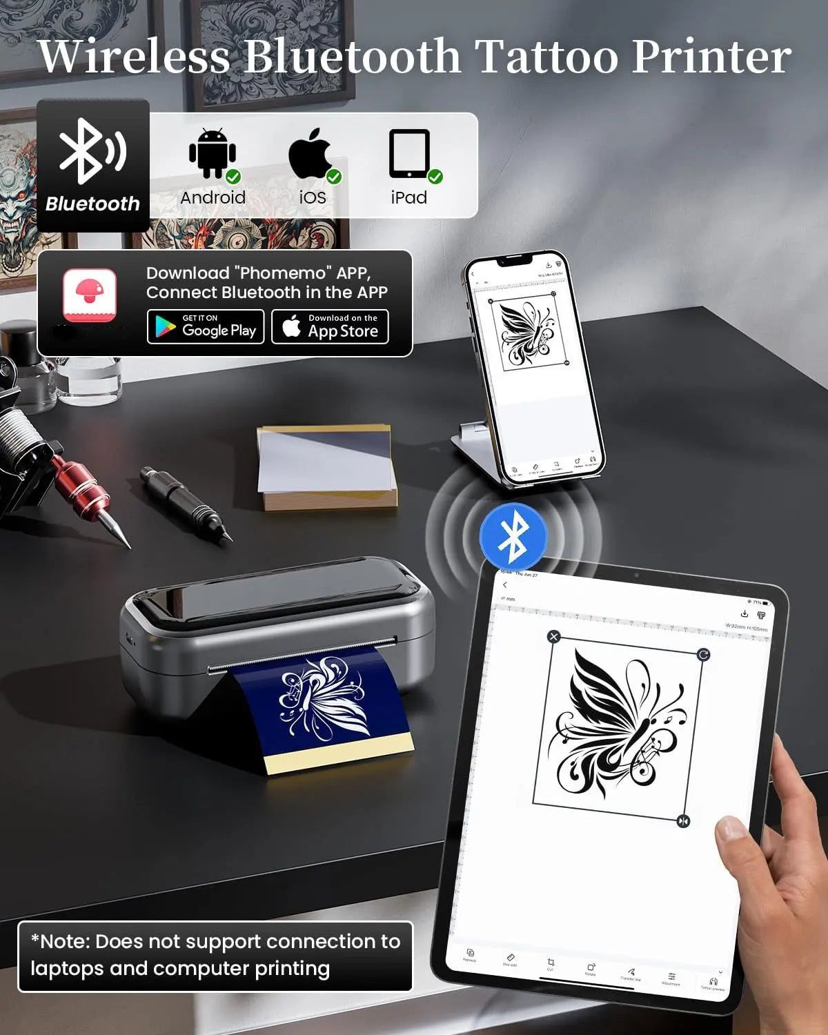 Com design portátil e conexão Bluetooth, ela imprime seus estênceis direto do celular ou tablet, com apenas um clique. E o melhor: você já recebe 30 folhas de papel transfer térmico totalmente GRÁTIS para começar a tatuar agora mesmo!