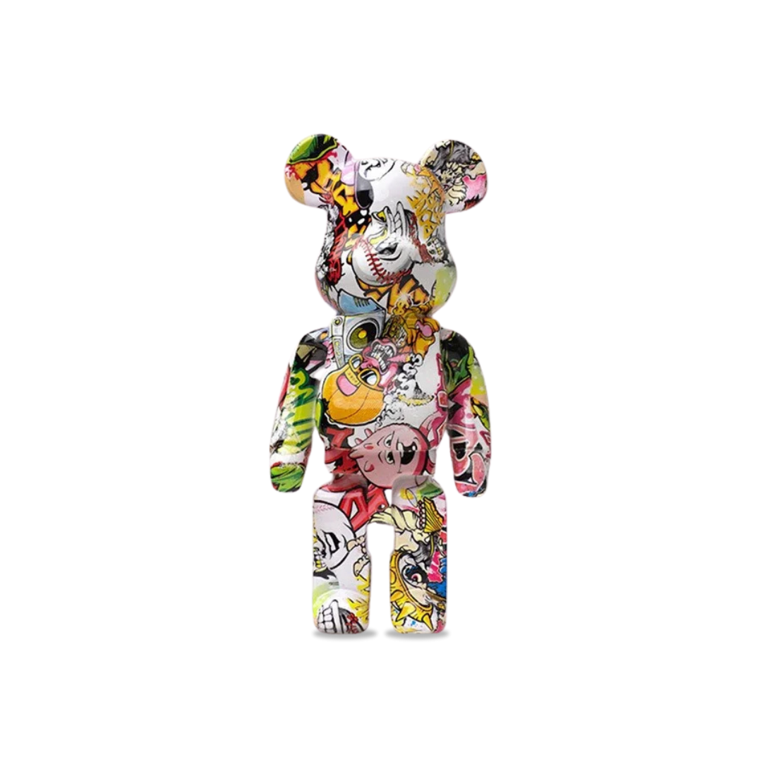 Edição exclusiva: Escultura de urso com pintura graffiti em resina durável. Interior com cavidade organizadora e acabamento brilhante. Padrões coloridos e vibrantes.